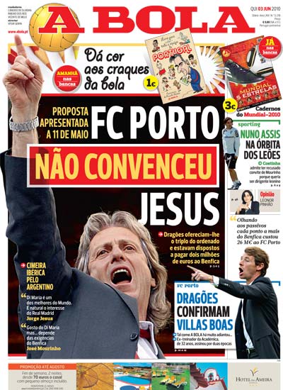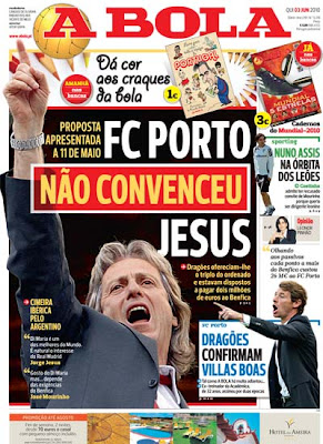 Hoje quando André Villas Boas é anunciado como novo treinador do FCPorto, já vem gasto de muitas páginas a falar dele, não é novidade e não excita nenhum portista. Para complicar mais o ramalhete, o jornal "A Bola" faz uma primeira página onde oficializa tudo aquilo que todos já sabíamos. O que normalmente Pinto da Costa não conta é que estas noticias apareçam nas primeiras páginas dos jornais, especialmente em dia que apresenta o seu novo menino de confiança. Hoje, ao ler se nas páginas d´"A Bola", o tal golpe de teatro que o senhor Pinto da Costa estava a preparar, tudo sai mal ao FCPorto e nada começa bem a este "menino" André Villas Boas.